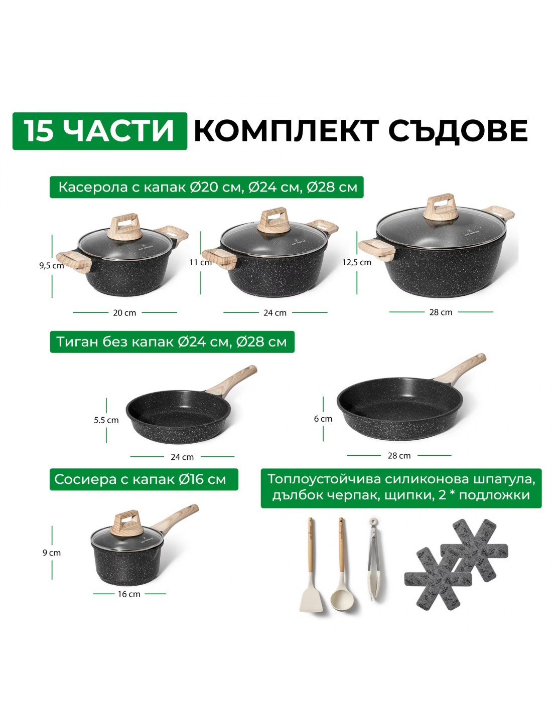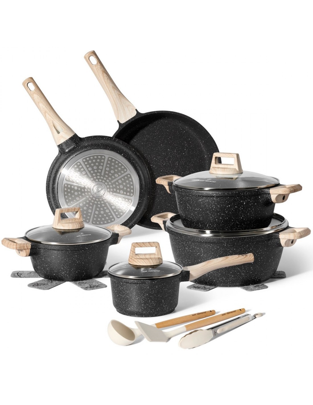 Комплект тенджери и тигани Just Perfecto JL-27, 15 ч, Аксесоари, Отливка, Мраморно покритие, Индукция, Черен